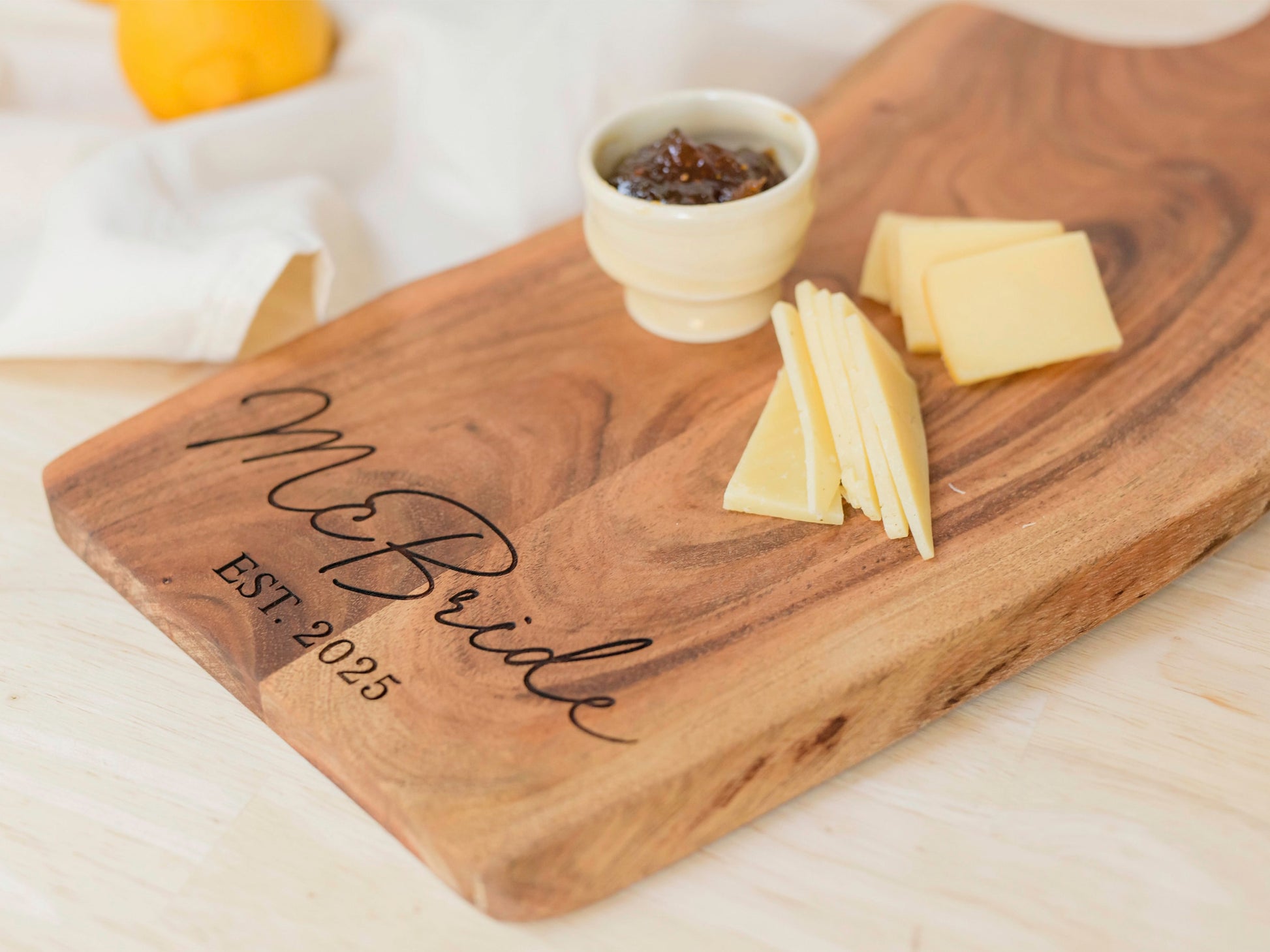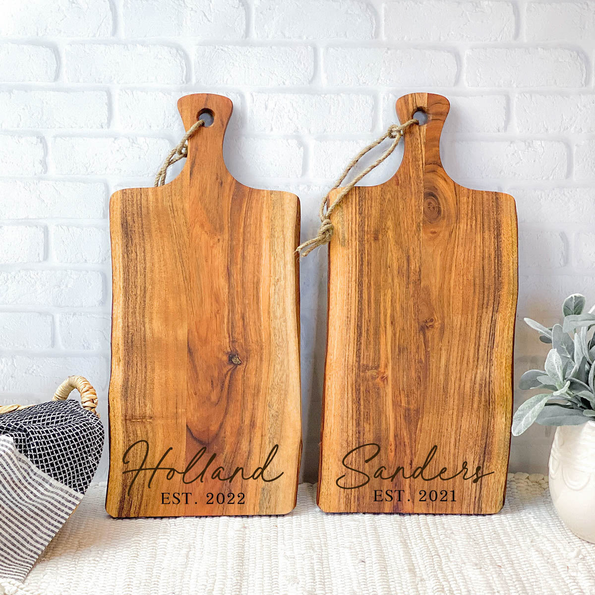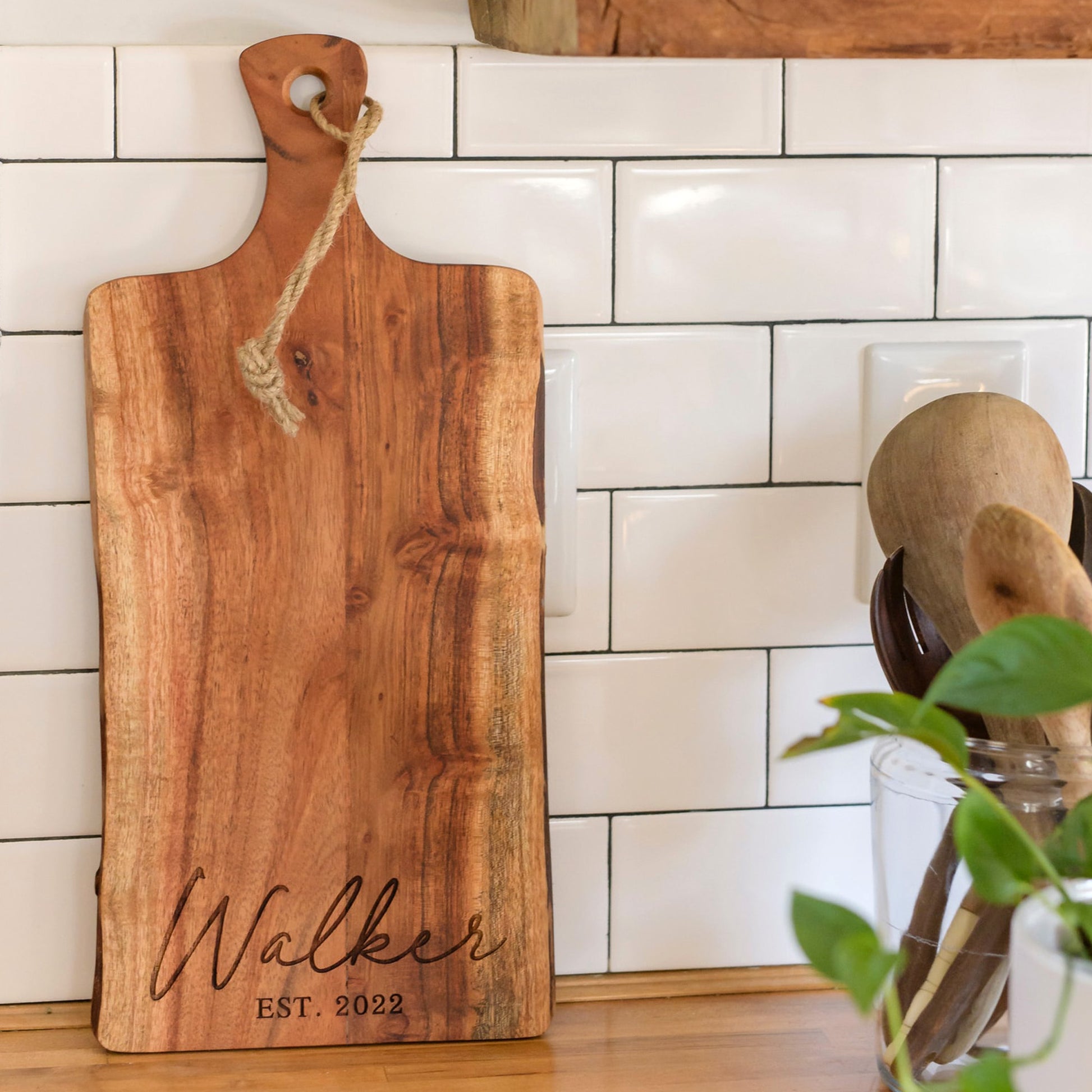 Please be aware that every cutting board is made from different wood and is unique. Due to the nature of wood, some boards may engrave slightly lighter or darker than the photo shows. Natural characteristics of wood will include knots, blonde color lines/stripes in the grain, minor cracks and coloring. Each wooden board is unique due to natural wood elements.